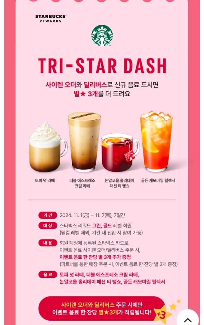 신규 음료 1잔에 별 3개 추가 적립해주니